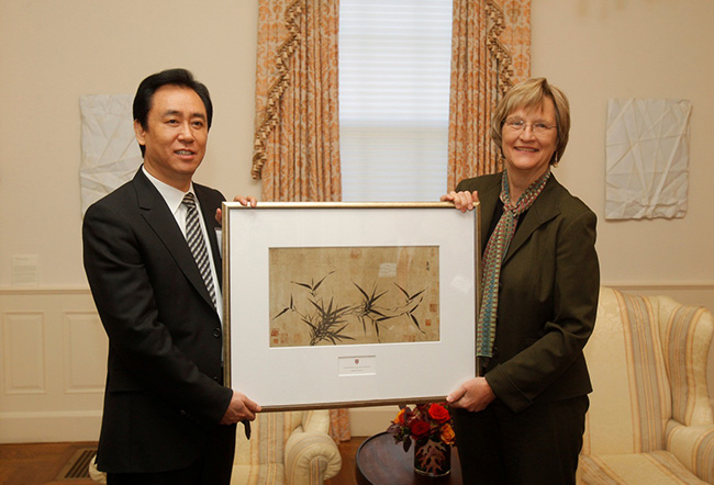 哈佛校长福斯特向董事局主席许家印赠送礼物